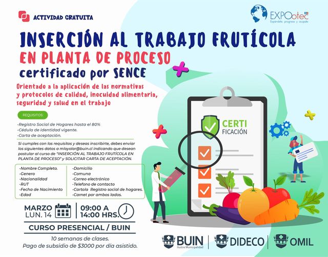 Si cumples con los requisitos, debes enviar los siguientes datos a [email protected] indicando que desean postular al curso de “INSERCIÓN AL TRABAJO FRUTÍCOLA EN PLANTA DE PROCESO” y SOLICITAR CARTA DE ACEPTACIÓN.