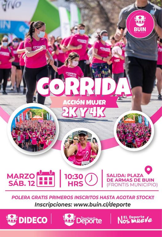 En el mes de la Mujer, te invitamos a participar en la próxima corrida Acción Mujer, organizada por la Municipalidad a través Dideco y su Departamento de Deporte. Te esperamos este sábado 12 de marzo, 10:30 hrs., en Plaza de Armas de Buin. Inscripciones en el siguiente link: www.buin.cl/deporte