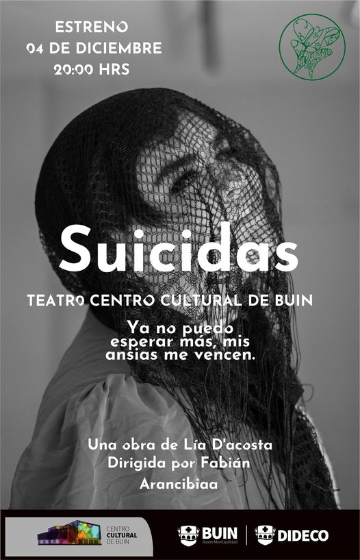 El Centro Cultural de Buin, tiene el agrado de invitar a todos los vecinos de la comuna a presenciar una nueva obra de teatro, la cual se presentara el día 04 de diciembre a las 20:00 horas. \”Es una obra dramática surrealista, que tiene un planteamiento dualista sobre lo que significa el suicidio, fantasmas que …