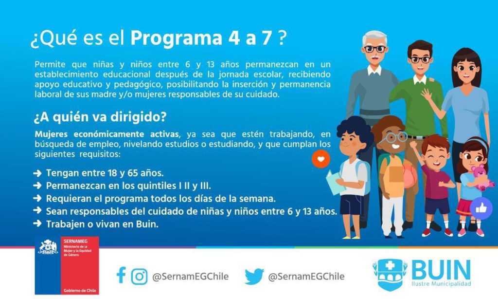 El programa 4 a 7 permite que niños y niñas entre 6 y 13 años permanezcan en un establecimiento educacional después de la jornada escolar, recibiendo apoyo educativo y pedagógico, posibilitando la inserción y permanencia laboral de sus madres y/o cuidadoras, disponiendo de un espacio de cuidado, para que las mujeres que trabajan puedan hacerlo …