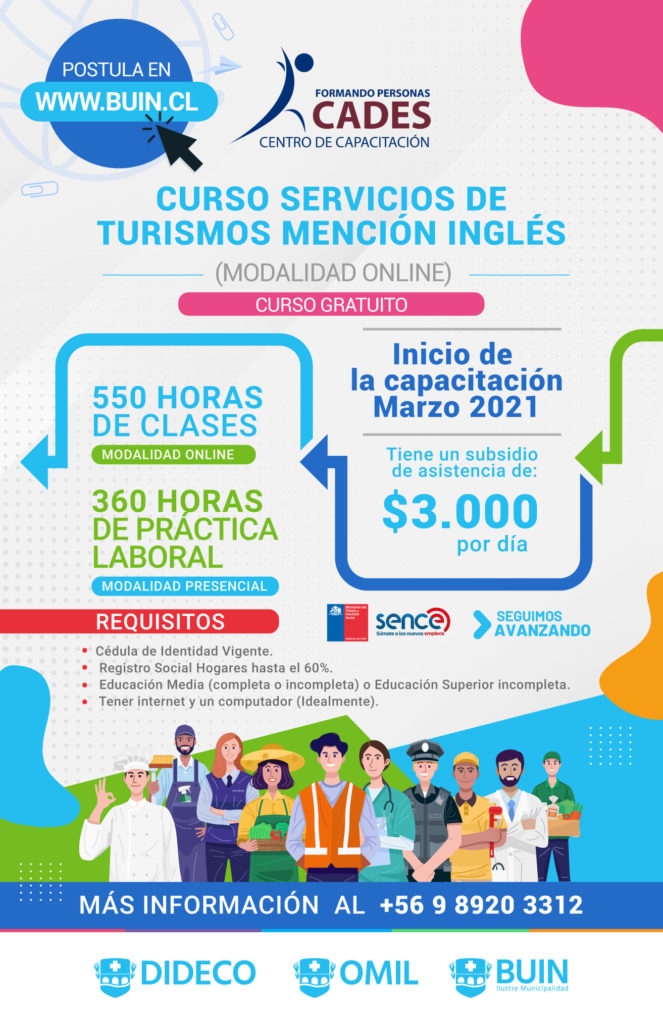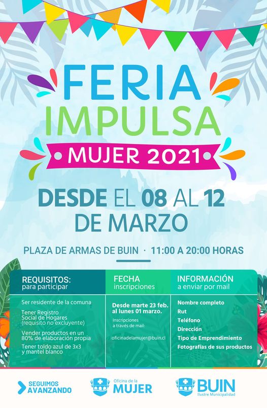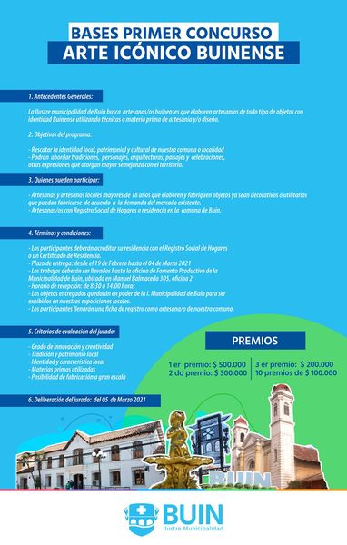Buscamos artesanas/os buinenses que elaboren un producto con identidad Buinense utilizando técnicas o materia prima de artesanía y/o diseño. Requisitos:- Artesanos mayores de 18 años.- Residir en la comuna de Buin, comprobable con Registro Social de Hogares. Postulación: desde el 22 de febrero hasta el 4 de marzo de 2021. Entrega de trabajos en oficina …
