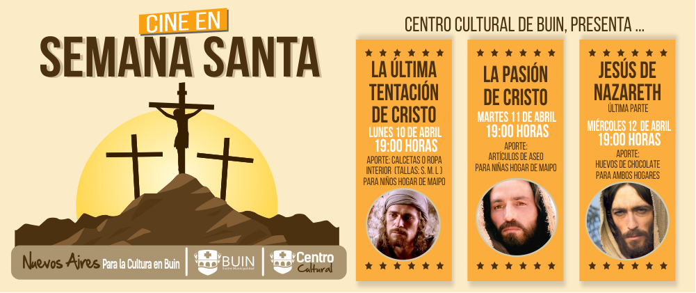 Del 10 al 12 de abril se presentarán a las 19:00 hrs. en el centro cultural de Buin, películas referentes a la Semana Santa. Les invitamos a difundir y asistir a estas actividades…